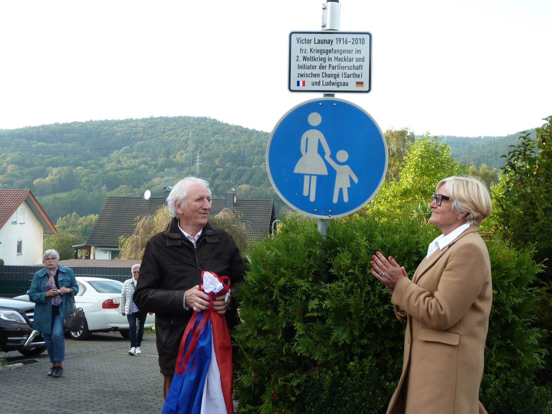 Auf Initiative des Ortsbeirats Mecklar erfolge zum Abschluss des Wochenendes am „Victor-Launay-Weg“ die Enthüllung einer Gedenktafel zu Ehren des „Vaters unserer Partnerschaft“. Ortsvorsteher Wilfried Leiter blickte in seiner Ansprache auf die Geschichte von Victor Launay zurück und würdigte die Verdienste des Franzosen. Die Enthüllung vollzogen höchstpersönlich und sichtlich gerührt Sohn Gérard Launay und Ehefrau Louisette.